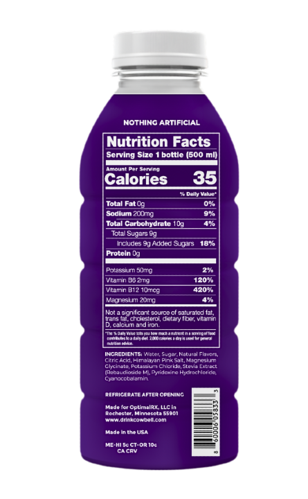 Cowbell Hydration has no artificial colors, sweeteners, flavors, or additives. Transparent labeling with no proprietary blends.