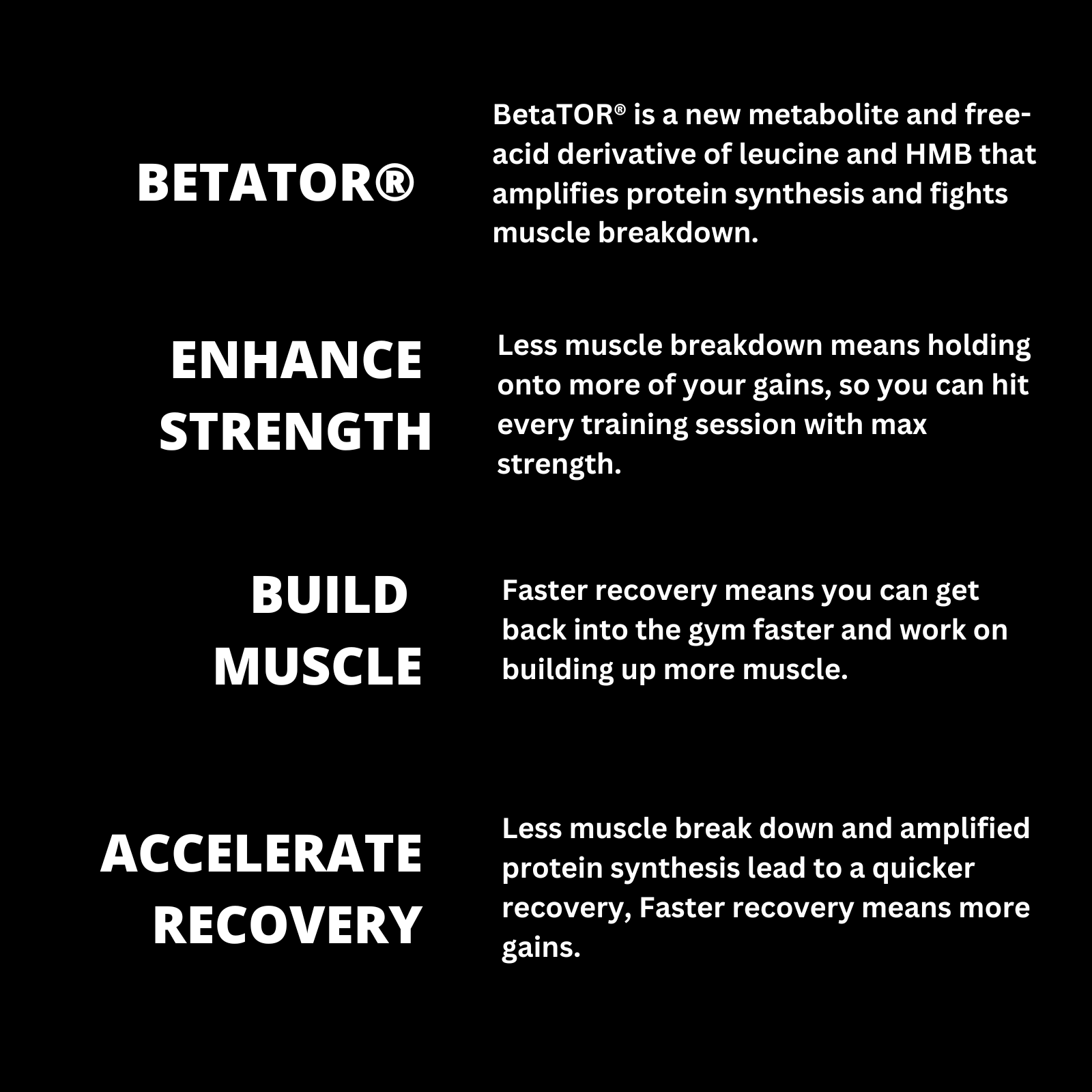 naturally in our bodies during the metabolism of the essential amino acid leucine. Studies show that BetaTOR increases strength and power, improves body composition, and aids in recovery from intense training. BetaTOR first prevents